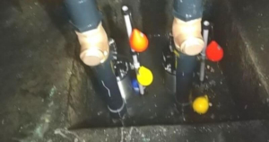 画像の赤いフロートスイッチまで汚水・雑排水の水位が上がると運転開始、黄色のフロートスイッチの高さまで排水されると運転停止する仕組みです。